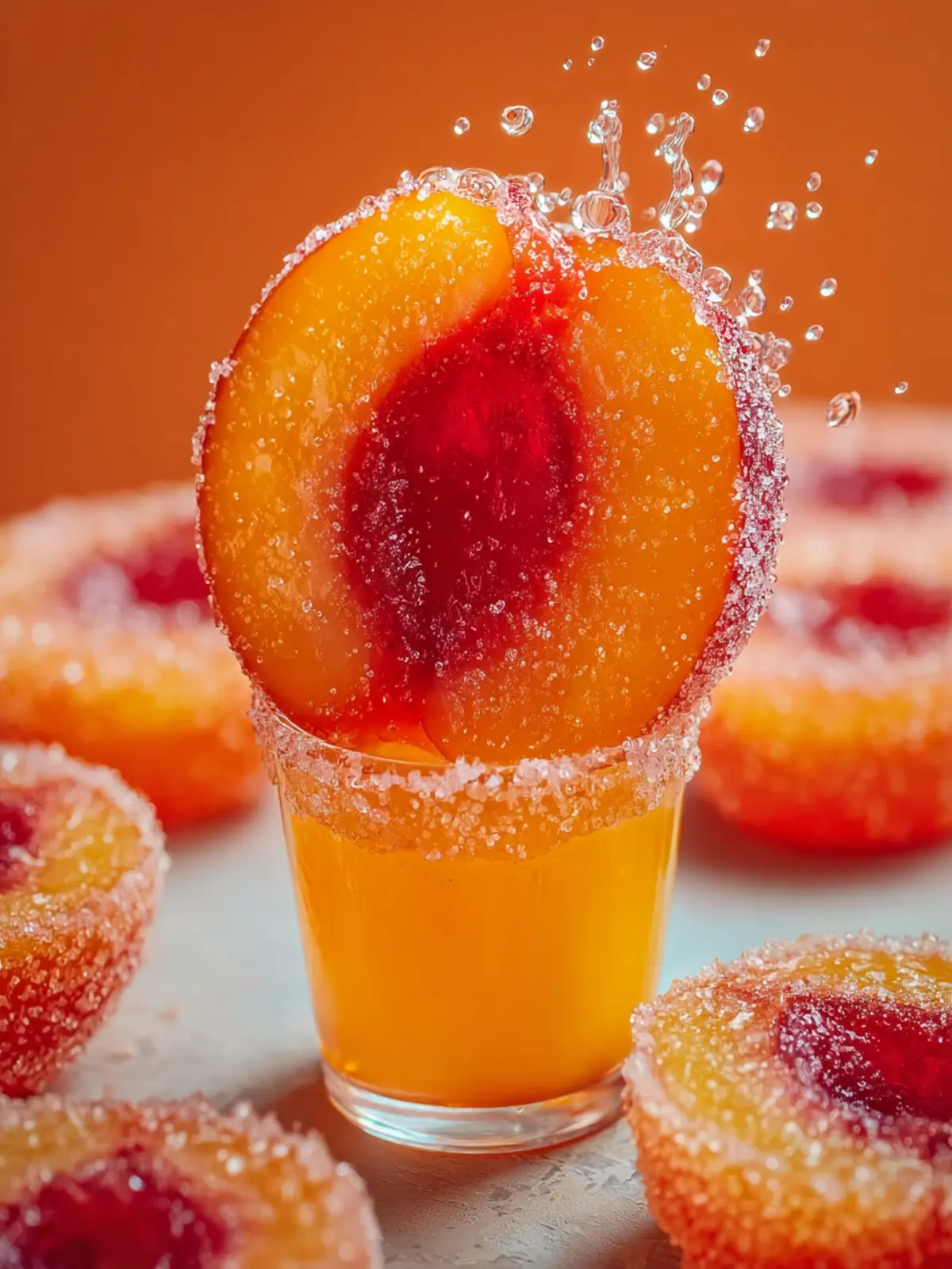 - Top each shot with a peach ring, either on the rim or gently pushed into the shot.