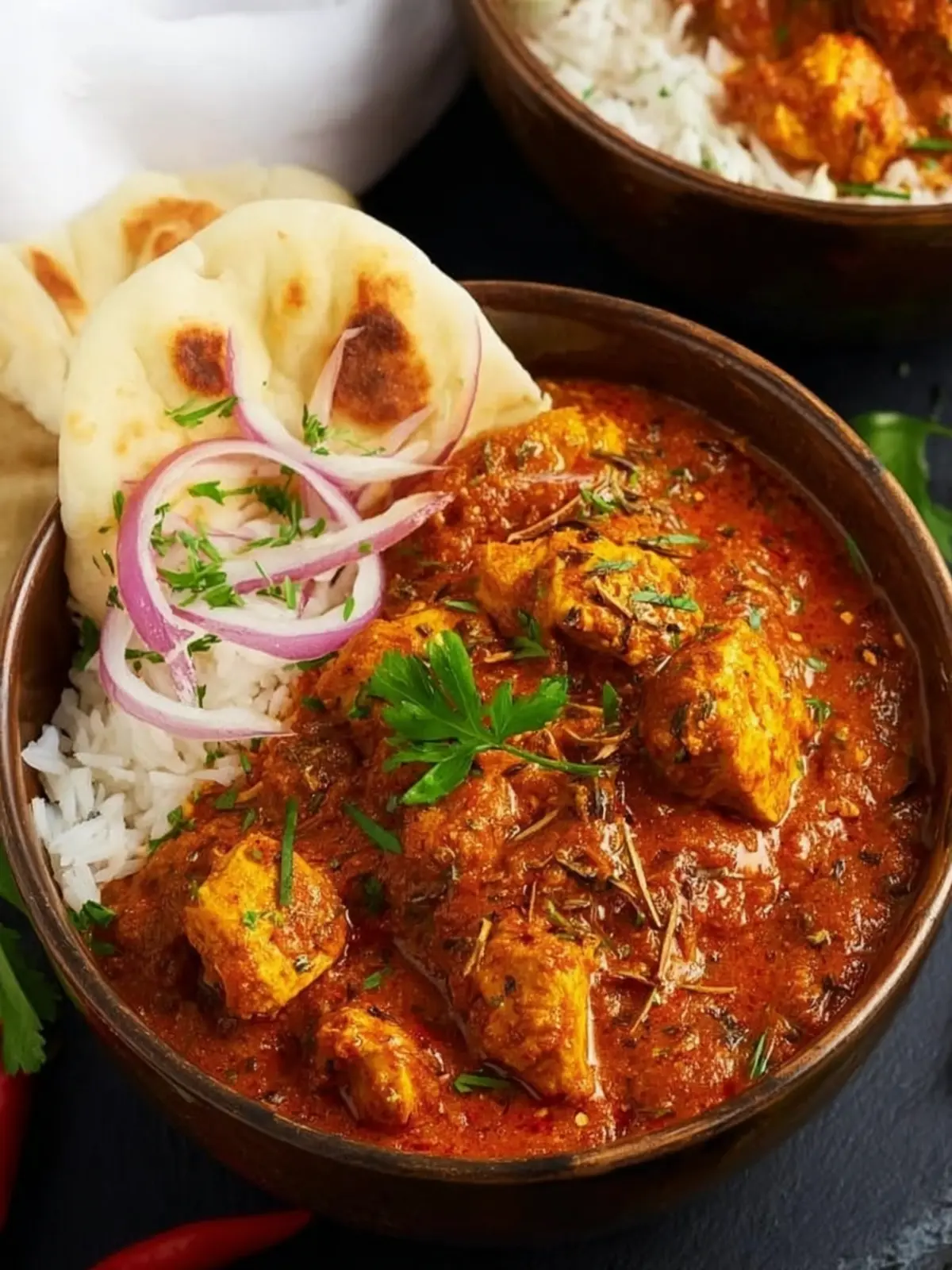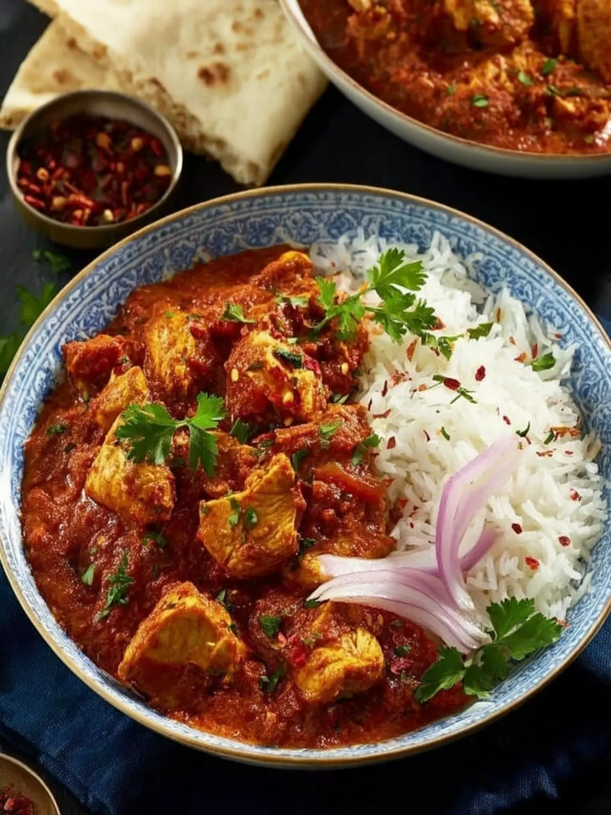 Naan Bread: Soft, warm naan is perfect for scooping up every delicious bite of your chicken curry. Whether you choose garlic naan or classic plain, it enhances the meal tremendously.