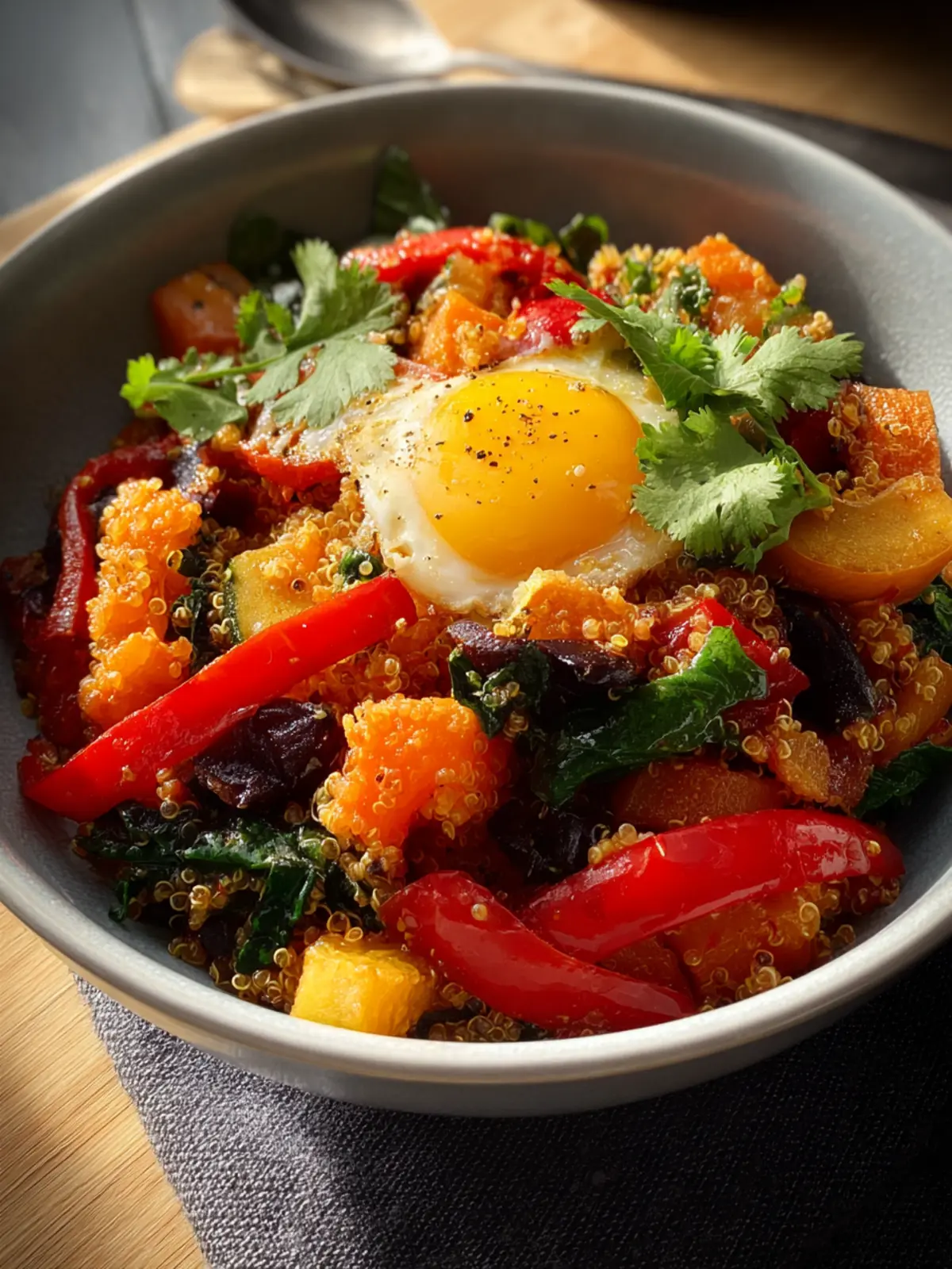 - Fluff quinoa with a fork and mix with the vegetable mixture.