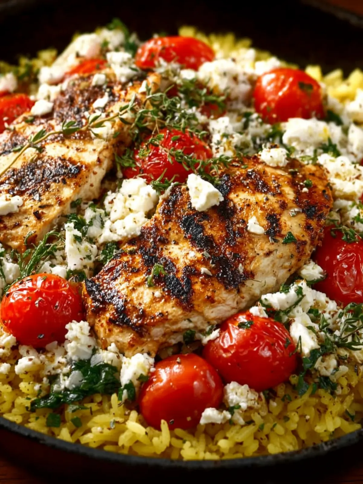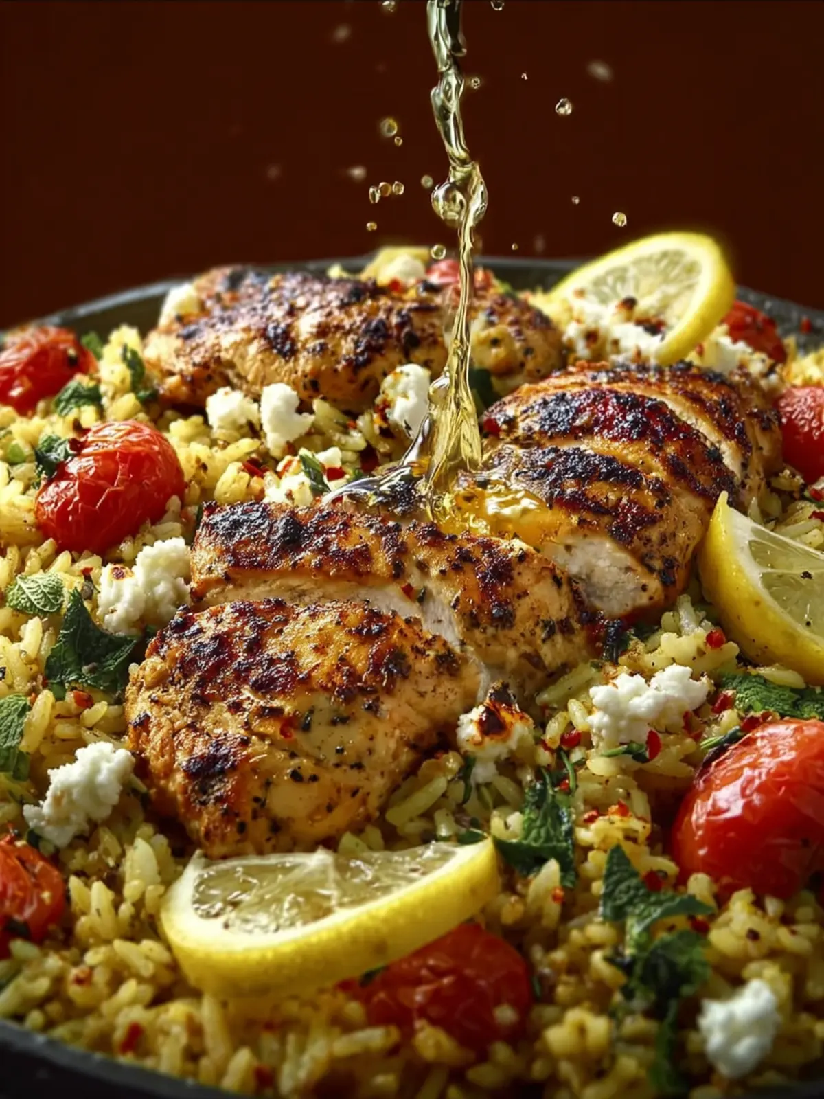 - Mix half of the feta cheese mixture into the skillet with the lemon rice. Slice the cooked chicken and arrange on top of the rice mixture, then reheat briefly on medium heat.