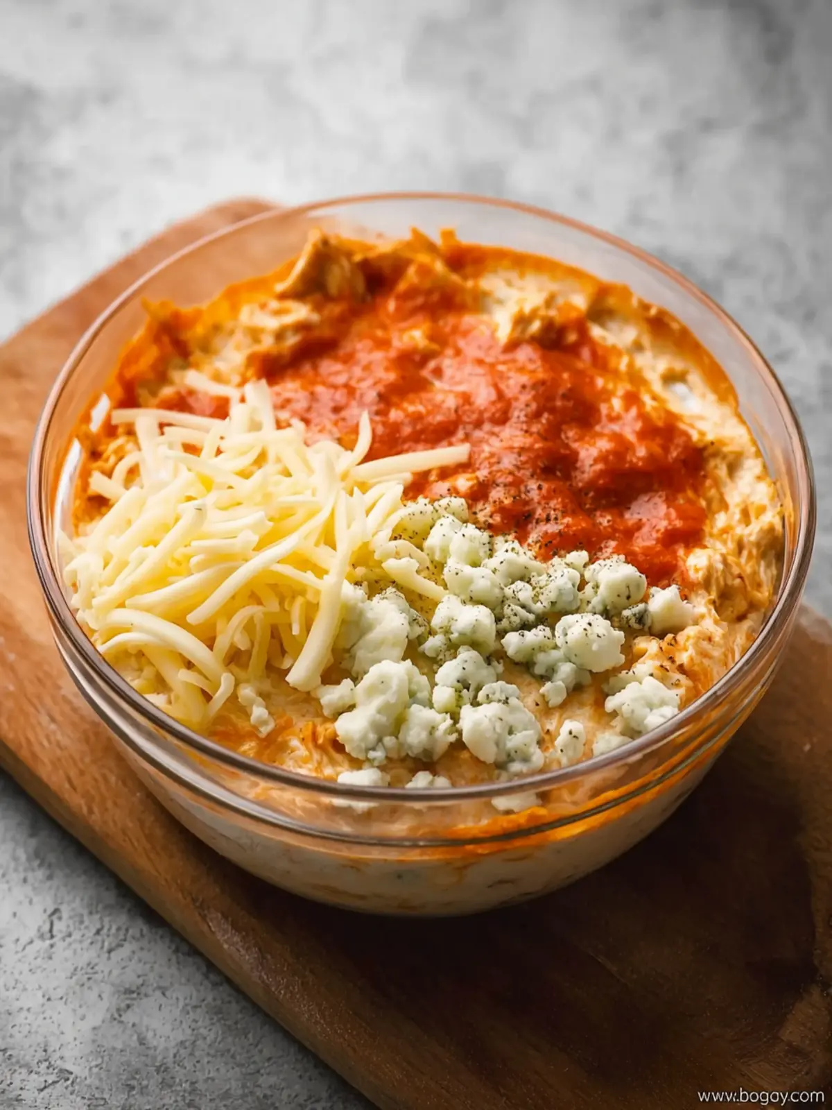 - In a large mixing bowl, combine shredded chicken, Greek yogurt, buffalo wing sauce, garlic powder, salt, and pepper.