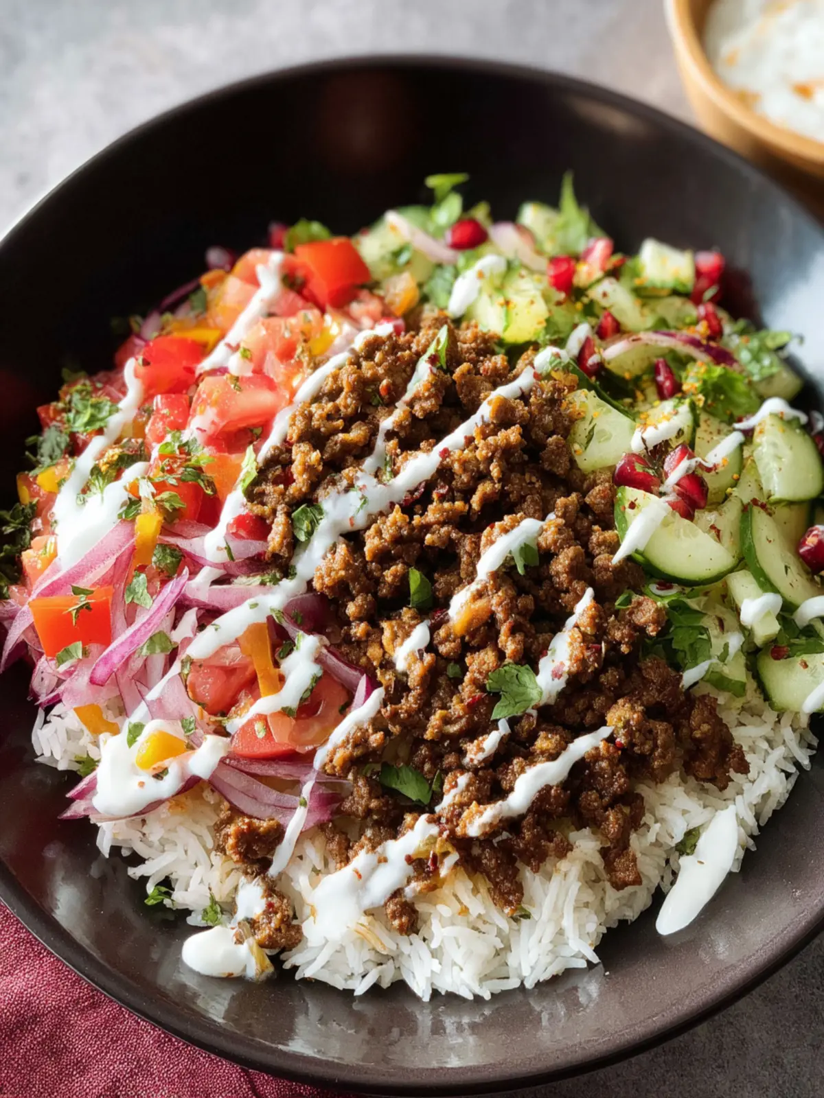 A flavorful dish of spiced ground beef served over rice with a creamy yogurt tahini sauce and fresh vegetables.
