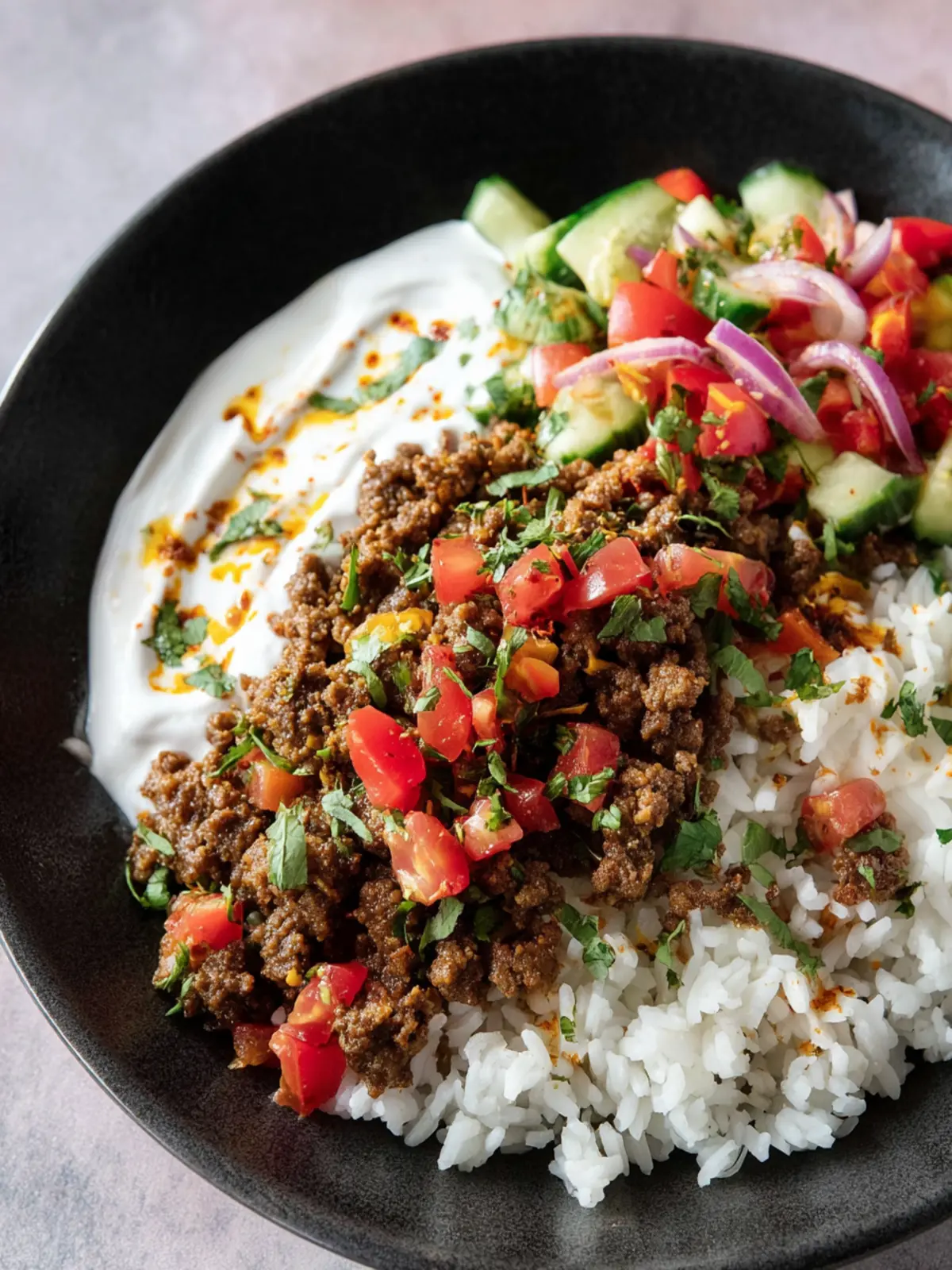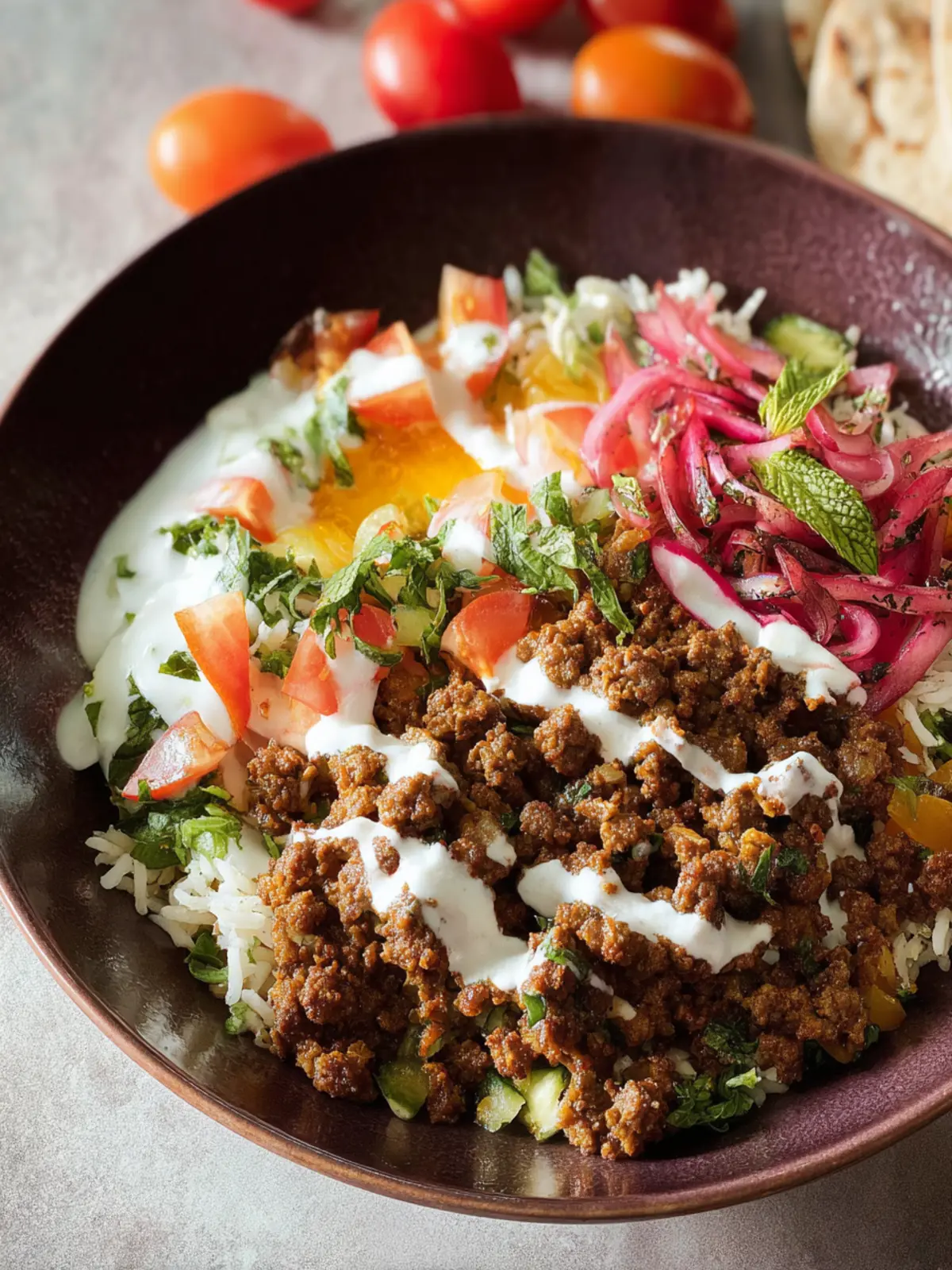A drizzle of plain yogurt or tahini sauce enhances the bowl with creaminess and tang. It’s the perfect cool contrast to the warm, spiced beef, making each mouthful delightful.