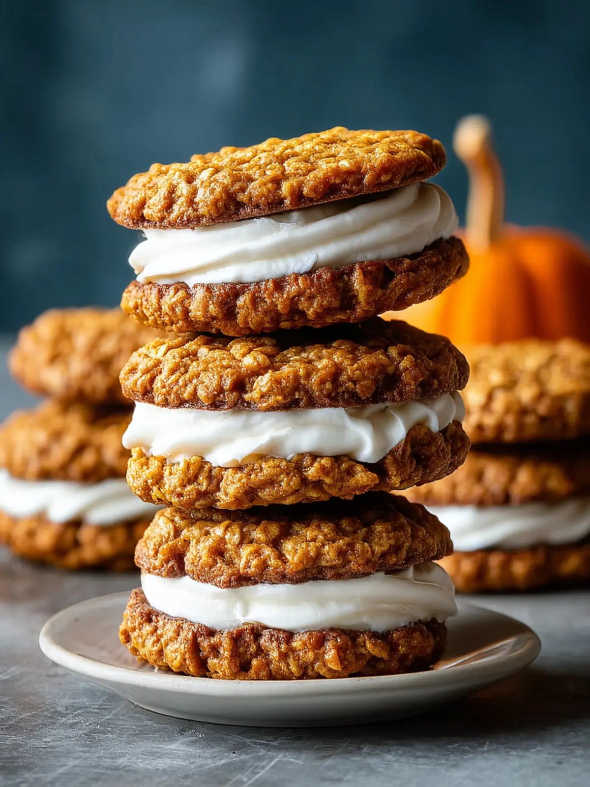 Delicious pumpkin oat cookies filled with a creamy frosting, perfect for fall treats.